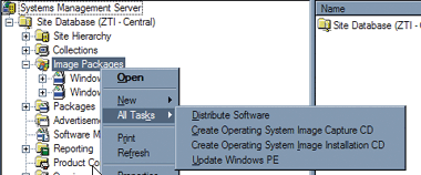 Первая задача при развертывании операционной системы с использованием пакета OSD — создать WIM-файл (.wim), содержащий образ системы. После того как будет загружен и установлен пакет дополнений, в оснастке SMS Administrator консоли Microsoft Management Console (MMC) появится новый элемент дерева, Image Packages. Контекстное меню для Image Packages (экран 1) состоит из четырех пунктов. В данном случае полезны два из них. Во-первых, Create Operating System Image Capture CD для создания носителя, на котором будет записан образ операционной системы эталонного компьютера (т. е. компьютера, операционная система которого копируется на другие, целевые машины), и WIM-файла. Во-вторых, Create Operating System Image Installation CD для установки операционной системы на новом компьютере в соответствии с созданным WIM-файлом.