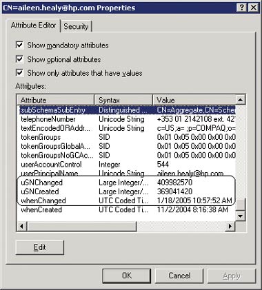 RUS идентифицирует почтовые объекты AD, проверяя значение атрибута mailNickname (известен как псевдоним (alias) в Exchange 5.5). AD ведет трассу всех изменений внутри своей структуры и присваивает каждому из них уникальный номер, который записывается в атрибут USNchanged объекта (см. экран 2). LDAP находит изменения достаточно просто: отыскиваются все объекты с заполненными мнемоническими почтовыми именами (nickname) и значением атрибута USNchanged, превышающим самое последнее значение USNchanged с момента последней проверки, выполненной RUS. Чтобы посмотреть запрос в действии, следует увеличить до максимума параметры диагностической регистрации объекта MSExchangeAL и в журнале Application отыскать событие с ID 8011. В описании события содержится отчет о запросе LDAP, сгенерированного RUS, в том числе значение USNchanged.