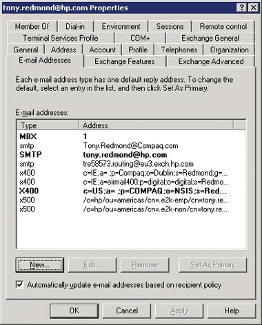 AD содержит адреса почтовых объектов в многозначных строковых атрибутах под названием proxyAddresses в формате type:address (например, SMTP:Tony@Tony.Net). На экране 1 показаны свойства почтового объекта AD. Обратите внимание, что некоторые значения в колонке Type написаны заглавными буквами. В этом случае Exchange рассматривает данный адрес как первичный адрес (primary address) определенного типа. Данный тип адреса может содержать только один первичный адрес; Exchange использует его как ответный адрес (reply address) по умолчанию для исходящих сообщений. Адреса в графе Type, указанные в строчном регистре, — вторичные адреса (secondary addresses), к которым Exchange обращается для разбора заголовка входящего сообщения, чтобы определить, может ли полученное сообщение быть переправлено в один из почтовых ящиков внутри организации. Вторичный адрес можно создать только для объекта, который уже имеет первичный адрес того же типа. Отметим, что каждый объект пользователя должен обладать первичным адресом SMTP (это напоминает требование Exchange 5.5, когда каждый объект должен был иметь адрес X.400).