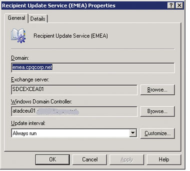 На экране 4 показаны свойства отдельных экземпляров RUS. Они понятны. Поле Domain содержит имя домена AD, который обслуживает данный RUS. Поле Exchange server указывает сервер Exchange, на котором запущен RUS, а поле Windows Domain Controller указывает DC, к которому подключается RUS. Логически никогда не помешает расположить сервер Exchange и DC поближе друг к другу, насколько это возможно (в терминах сети), тогда они всегда будут «видеть» друг друга. Если сервер Exchange и DC не имеют устойчивого соединения, время выполнения запросов LDAP, от которых зависит работа RUS, может выходить за допустимые пределы, могут возникнуть и проблемы иного рода — в любом случае работа RUS может стать непредсказуемой, что впоследствии неблагоприятно скажется на точности заполнения атрибутов AD.