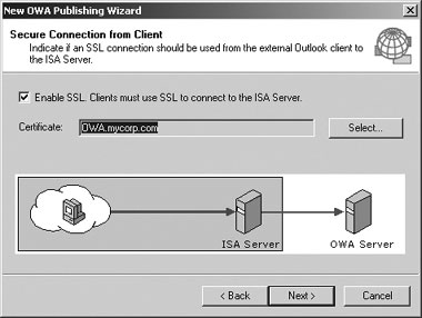Закладка Bridging содержит еще две важные возможности, относящиеся к настройке SSL. Если желательно, чтобы ISA Server соединялся только с опубликованными Web-сайтами при условии, что пользователь набирает HTTPS URL в строке адреса браузера, нужно выбрать пункт Require secure channel (SSL) for published site. Эта установка применима только к мостам SSL по вариантам 1 и 3. Если требуется, чтобы ISA Server при обращении к внешнему Web-серверу OWA выполнял строгую аутентификацию, основанную на сертификатах SSL, следует выбрать пункт Use a certificate to authenticate to the SSL Web server и указать сертификат. Эта установка применима только для мостов SSL по вариантам 2 и 3. В последнем случае необходимо установить на системе с ISA Server клиентский сертификат SSL в хранилище сертификатов службы W3Proxy.
