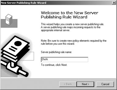 После этого надо создать правило публикации для внешнего Web-сервера OWA. В оснастке ISA Management разверните контейнер публикаций, затем щелкните правой кнопкой мыши на контейнере Server Publishing Rules. Выберите New, Rule для запуска мастера новых публикаций серверов New Server Publishing Rule Wizard, как показано на экране 2. Введите имя правила (например,OWA), после чего нажмите Next. На странице Address Mapping нужно ввести IP-адрес внешнего Web-сервера OWA в окне IP address of internal server, далее указать в поле External IP address on ISA Server IP-адрес, по которому ваш ISA Server будет доступен из внешнего мира. На странице Protocol Settings следует выбрать протокол HTTPS Server. На странице Client Type выберите Any request. Чтобы убедиться, что конфигурация ISA Server изменилась, остановите и запустите вновь службы ISA Server Web Proxy and Firewall.