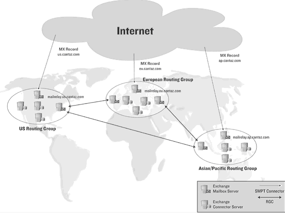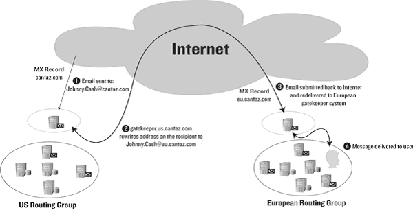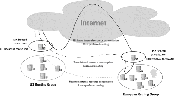 Простейший механизм оптимизации трафика входящей электронной почты состоит в том, что в почтовый адрес включается компонент, указывающий на географический регион, куда должно быть направлено сообщение еще в процессе прохождение по каналам Internet. Представьте, к примеру, что базирующийся в США служащий Уилли Нелсон имеет электронный адрес Willie.Nelson@us.cantaz.com. Чтобы оптимизировать входящий почтовый трафик, нужно опубликовать запись DNS MX, в соответствии с которой все сообщения с адресами, содержащими компонент us.cantaz.com., должны направляться на ретранслятор почты mailrelay.us.cantaz.com, расположенный в США. Тогда почтовые сообщения, направляемые Уилли, будут поступать к нему по самому эффективному маршруту на SMTP-коннектор, расположенный ближе всего от того места, где он находится. Обычно в такую MX-запись включаются и другие точки входа с указанием на то, что расходы на передачу сообщений в эти точки будет выше. Таким образом, даже в том случае, если самая малозатратная точка входа выйдет из строя, сообщение тем не менее будет доставлено. Впрочем, надо иметь в виду, что результат перенаправления сообщения на более затратный ретранслятор в связи с отказом будет неоптимальным с точки зрения использования ресурсов. Подобным же образом, все остальные связанные с конкретными точками записи MX будут настраиваться с использованием резервных серверов-ретрансляторов почты.