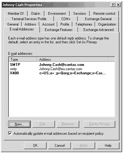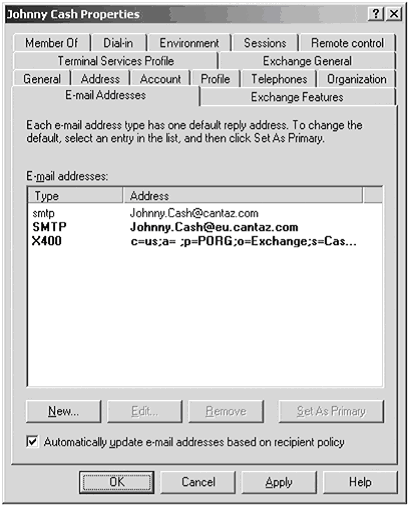 Когда происходит модификация адреса, SMTP-система ретрансляции перенаправляет сообщение обратно в Internet, и оно доставляется ретранслятору gatekeeper.eu.cantaz.com. Этот расположенный в Европе ретранслятор почты, располагающийся, как правило, в отдельной организации Exchange (хотя он может находиться в той же организации, что и американский SMTP-ретранслятор почты), никаких манипуляций с адресом не производит, а просто переправляет сообщение серверу-мосту SMTP в целевой организации Exchange. Объект "пользователь", представляющий почтовый ящик Exchange для получателя, имеет два адреса SMTP: почтовый адрес, содержащий указание на географическую точку, должен быть вторичным прокси-адресом SMTP, обеспечивающим доставку сообщения, но первичный адрес SMTP должен быть нормализованным SMTP-адресом, как показано на Рис. 5. Таким образом, первичный и вторичный адреса SMTP между модифицированным объектом и фактическим пользовательским объектом являются зеркальными отображениями друг друга. Для того чтобы организация Exchange принимала все требуемые почтовые адреса, вам придется создать соответствующие политики для получателей.