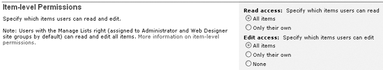 Защита SharePoint представляет собой комбинацию различных мер безопасности на уровне как портала (через SharePoint Portal Server), так и сайта (через Windows SharePoint Services). Но SharePoint не хватает возможности устанавливать специальные разрешения для отдельных фрагментов контента. В документации и пользовательском интерфейсе продукта можно встретить упоминания о защите на уровне элементов, которая применима к списку SharePoint Portal Server, хотя и примитивна: в сущности, пользователь с правами Administrator может управлять разрешениями других пользователей для чтения и редактирования элементов списка. На экране 1 показан раздел Item-level Permissions экрана Properties элемента списка. SharePoint не располагает функциями для управления разрешениями, назначенными одиночному элементу списка или фрагменту информации. Прежде чем рассмотреть пробел в системе безопасности на уровне элементов и возможные пути его устранения, важно понять общую архитектуру безопасности SharePoint и различия в безопасности SharePoint Portal Server и Windows SharePoint Services.