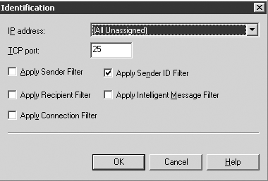 После настройки глобальных параметров можно определить конфигурацию фильтра Sender ID на соответствующем виртуальном SMTP-сервере внутри организации. Этот параметр тщательно спрятан. Для доступа к нему следует щелкнуть правой кнопкой мыши на нужном виртуальном SMTP-сервере в ESM, выбрать пункт Properties, щелкнуть на кнопке Advanced, а затем на кнопке Edit. Появляется диалоговое окно Identification, в котором необходимо установить флажок Apply Sender ID Filter (экран 3). Дополнительные сведения о настройке глобальных и серверных параметров Sender ID приведены в статье Microsoft «New Weapons In The Fight Against Spam» по адресу http://www.microsoft.com/technet/technetmag/issues/ 2006/01/newweapons/default.aspx.