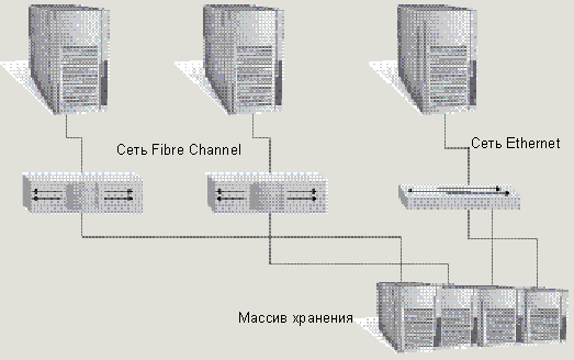 Основу SAN составляют сетевые коммутаторы, которые подключают серверы к массивам хранения данных. Топология SAN подобна той, по которой связываются коммутаторы Ethernet, как показано на рисунке. На физическом уровне SAN включает сеть из оптоволоконных каналов Fibre Channel или коммутаторов Ethernet. Оптоволоконные коммутаторы подключены к адаптерам HBA и в массиве хранения, и на сервере. Коммутаторы Ethernet соединяются с сетевым адаптером Ethernet на сервере и в массиве хранения.