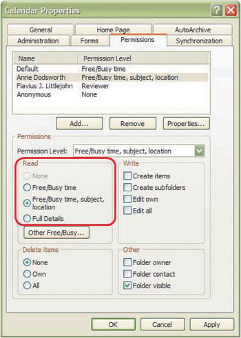 Для папки Calendar в почтовом ящике Exchange 2007 заметно усовершенствована возможность управления количеством доступной информации для функции Free/Busy. Как показано на экране 4, можно точно определить, как информация выделяется для совместного использования по усмотрению администратора: запрет на использование, доступность в течение различных периодов времени, время free и busy, а также предмет и место назначения либо полная доступность. Новый планировщик, Scheduling Assistant, работает с новой службой назначения времени встречи в Exchange 2007, он подсказывает, когда могут присутствовать приглашенные лица и какие помещения имеются в наличии.