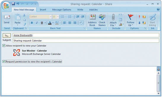 Если речь идет о коллективном использовании папок по умолчанию — например, папки Calendar, — можно включить запрос получателя на совместное использование этой папки, как видно из экрана 3. На этом рисунке также показана галерея, которая замещает меню и панели инструментов на отдельных элементах Outlook. Получатель может выбрать Allow или Deny (разрешить или запретить), когда поступит запрос о коллективном пользовании.