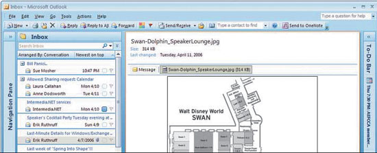 Office — интегрированный программный комплекс, поэтому каждое приложение должно иметь информацию о том, как обрабатывать документы и прочие объекты, создаваемые другими программами Office. Желательно, чтобы в случае необходимости эти объекты обрабатывались в истинно интегрированной манере. Именно такой подход реализован в Outlook 2007 по отношению к вложенным файлам. Он соответствует принципу этого приложения, согласно которому пользователь должен как можно чаще работать в одном окне. Поэтому, когда пользователь выводит на экран сообщение с вложенным файлом, Outlook 2007 может отобразить этот файл непосредственно в панели чтения. При этом не нужно открывать второе приложение, если требуется лишь быстро просмотреть документ.