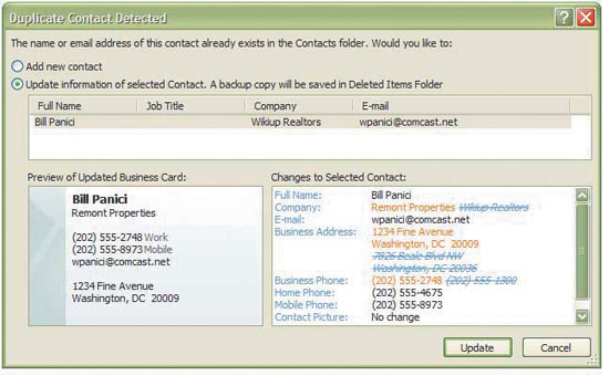 Наконец, Outlook 2007 исключит незначительные недочеты, которые беспокоили пользователей Outlook. Эта новая версия позволит просматривать файлы приложений с изображениями и файлы с документами Office непосредственно в панели чтения. На экране 6 показан просмотр изображения без панелей навигации и To-Do Bar, что позволяет увеличить область изображения. Можно воспользоваться наложениями календарей, которые будут иметь разные цвета, это поможет различать рабочие графики. При добавлении в Outlook 2007 дубликата уже имеющегося контакта Outlook 2007 не просто сольет оба набора данных, как это было в прежних версиях, но даст возможность увидеть изменения, которые будут сделаны, как показано на экране 7. Кроме того, прежние версии всегда отбрасывали все новые замечания при обновлении контакта, теперь же Outlook 2007 не только сохраняет их, но и показывает исправления при обнаружении дубликата элемента.