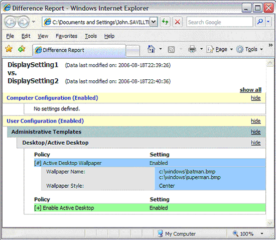 - В отчете будет отображено различие между выбранными объектами GPO: