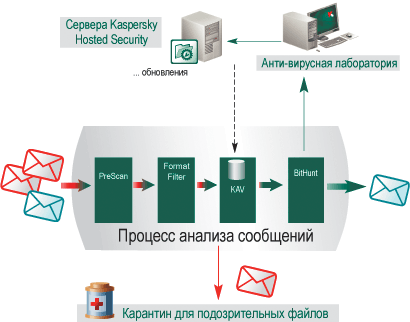 Функционал решения включает в себя антивирус- и антиспам-компоненты, с помощью комбинации различных технологий позволяющие обнаружить и блокировать как вредоносные программы, так и нежелательные почтовые сообщения. Неотъемлемой частью этих модулей сервиса является система проактивного обнаружения угроз Kaspersky BitHunt, разработанная с учетом специфики работы с почтовыми потоками и позволяющая защитить корпоративных пользователей от угроз, процедуры обнаружения которых еще не добавлены в антивирусные и антиспам-базы. Отдельно стоит отметить надежность и отказоустойчивость сервиса Kaspersky Hosted Security: mailDefend, которые достигаются благодаря наличию нескольких центров обработки данных. В случае проблем с почтовым сервером компании-клиента вся переписка хранится в очереди сообщений и с восстановлением работоспособности сервера автоматически передается клиенту.