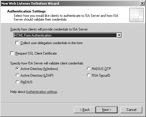 Нововведение при настройке Web-приемников в ISA Server 2006 — страница настройки Authentication Settings (см. экран 1). В раскрывающемся меню предлагаются различные виды аутентификации — HTML Form Authentication, HTTP Authentication, SSL Client Certificate Authentication и No Authentication. Параметры проверки в значительной степени «привязаны» к выбранной схеме аутентификации. Например, можно указать, что делегированные полномочия о пользователе будут задаваться в виде формы (флажок Collect user delegation credentials in a form), запросить SSL-сертификат и настроить способ проверки сертификатов в ISA Server 2006. Другие параметры проверки — Active Directory (AD) Windows или LDAP, Remote Authentication Dial-In User Service (RADIUS), RADIUS One-Time Password (OTP) и RSA SecurID.