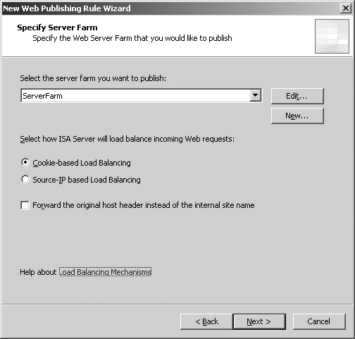 На странице Internal Publishing Details указывается внутреннее имя сайта, устанавливается, будет ли ISA Server использовать SSL для подключения к сайту (и шифровать трафик DMZ), и будет ли оригинальный заголовок хоста пересылаться на сайт. Эта же страница позволяет настроить специальный каталог на целевом Web-сервере. После щелчка по кнопке Next вызывается выпадающее меню, из которого нужно выбрать Web-приемник для серверной фермы, которую планируется публиковать, или инициировать процесс настройки Web-приемника для новой серверной фермы, если ранее описанные шаги еще не выполнялись. При выборе Web-приемника серверной фермы на странице Specify Server Farm можно настроить параметры, согласно которым ISA Server будет балансировать нагрузку входящих запросов (см. экран 3). Если выбрать Cookie-based Load Balancing, клиентам будет выдаваться небольшой фрагмент данных (cookie), информирующий ISA Server 2006 о том, какому из серверов фермы следует продолжить обработку той или иной клиентской сессии. При организации балансировки по исходному IP-адресу сервер поддерживает сессию согласно указанному значению IP-адреса клиента.