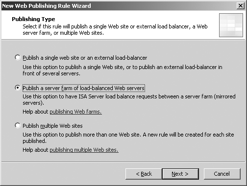 После того как серверная ферма настроена, нужно опубликовать Web-сайты. Для этого следует выбрать Publish Web Sites на вкладке Tasks консоли ISA Server Management. Вызывается мастер установки, похожий на тот, что использовался в ISA Server 2004, пока вы не достигнете страницы Publishing Type (см. экран 2). Здесь нужно указать, должен ли ISA Server публиковать один-единственный Web-сайт или внешний балансировщик нагрузки (такой, как NLB), серверную ферму из сбалансированных по нагрузке Web-серверов или же несколько отдельных Web-сайтов.