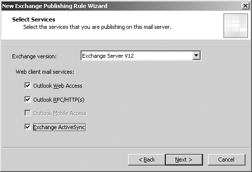 Перед тем как начать процесс публикации, нужно настроить Web-приемники. Затем требуется выбрать в списке Firewall Policy Tasks задачу Publish Exchange Web Client Access — запустится мастер правила публикации New Exchange Publishing Rule Wizard. Следует ввести имя правила и нажать Next. На экране Select Services (см. экран 4) можно выбрать публикуемую через ISA Server 2006 почтовую службу — параметр Web client mail services. Также можно выбрать версию Exchange из предлагаемого списка — Exchange Server 5.5, Exchange 2000, Exchange 2003 или Exchange 2007. Почтовые службы — Web client mail services — различаются от одной версии Exchange к другой (например, Exchange 2007 не поддерживает Outlook Mobile Access). Если Web-приемник уже настроен на аутентификацию на базе форм, то в этом случае отсутствует поддержка Exchange ActiveSync.