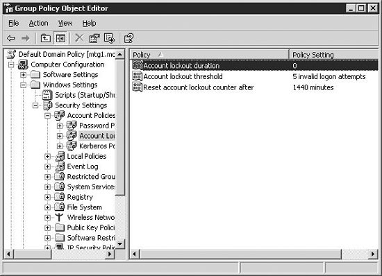 Проникнуть в сеть будет еще труднее, если применить продуманную политику блокирования, которая реализована в большинстве сетей с паролем. Политика блокирования для Windows состоит из трех значений, которые определяют, сколько попыток ввода пароля разрешается для каждой учетной записи в течение заданного периода времени и какие действия следует предпринять, если пользователь превышает этот порог. Например, на экране 2 показана политика, ограничивающая пользователя пятью последовательными попытками (пять неверных попыток входа) в течение 24 часов (1440 минут). Если значение длительности блокирования — 0, то администратор или другой пользователь с делегированными полномочиями должен разблокировать защищенную учетную запись. Такая политика блокировки подходит для многих компаний.