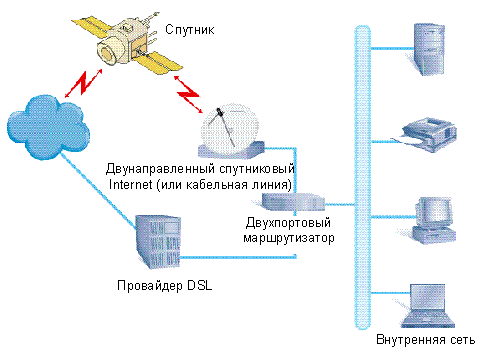 Существует несколько производителей, выпускающих маршрутизаторы с парой разнотипных внешних портов, которые обеспечивают такой отказоустойчивый доступ в Internet, и самое примечательное — это их цена: от 250 до 500 долл. за устройство. На рисунке показан маршрутизатор с парой разнотипных внешних портов и два подключения к Internet-провайдеру, которые соединяют локальную сеть и Internet. Хотя на рисунке изображено применение двусторонней спутниковой технологии, если есть возможность задействовать наземных Internet-провайдеров, лучше использовать их. Они обеспечат большую скорость и надежность.