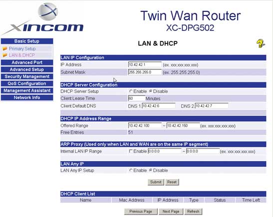 Будем считать, что такой важный шаг, как выбор маршрутизатора, уже позади. Теперь следует заняться настройкой его порта LAN и одного из портов глобальной сети с использованием подходящих настроек IP. Когда вы впервые прикасаетесь к XC-DPG502, это устройство (как и большинство шлюзов) имеет настройки по умолчанию для сервера DHCP и выдает адреса из подсети 192.168.1.0. Новый маршрутизатор заменит текущий брандмауэр/маршрутизатор и займет место актуального шлюза по умолчанию в IP-настройках систем локальной сети.