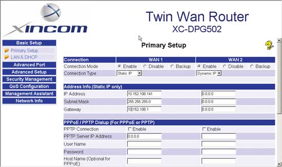 Я обращался к нескольким производителям с предложением протестировать их маршрутизаторы данного вида и описать результаты в статье. XiNCOM прислала свои модели XC-DPG502 и XCDPG603. Я использовал модель XC-DPG502, поскольку она была не такая дорогая и имела все базовые функции для обеспечения высоконадежного доступа в Internet. Несмотря на то что о решениях с использованием маршрутизаторов с парой разнотипных внешних портов я рассуждаю, опираясь на пример маршрутизатора XiNCOM, настройка и аргументы применимы и к устройствам других производителей, включая модели серий XiNCOM DPG500 и DPG600, Symantec Gateway Security 300 Series, Linksys RV082 и HotBrick VPN 800/2.