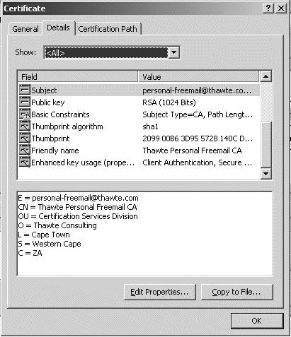 Одно существенное отличие состоит в том, что в PKI открытый ключ обычно хранится в формате данных, известном как сертификат. Сертификаты могут содержать намного больше информации, нежели обычные ключи. К примеру, сертификаты обычно содержат дату истечения срока действия, так что мы знаем, когда сертификат и ассоциированный с ним ключ уже не будут действительны. Кроме того, сертификат может включать имя, адрес, номер телефона владельца ключа и другие данные. На экране 2 представлено содержимое сертификата в том виде, в каком оно отображается в окне программы Microsoft Internet Explorer (IE) или Outlook. В определенной степени содержимое сертификата зависит от того, какие именно данные желает разместить в нем владелец.