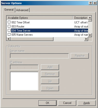 Последующий набор похожих команд netsh добавляет адрес шлюза, задает имена для серверов имен WINS, серверов DNS и указывает имя домена. Хочу обратить ваше внимание на параметр команды optionvalue. Числом выбирается параметр зоны, имеющий тип данных BYTE, WORD, DWORD, STRING, IPADDRESS, и далее задается значение параметра. Числовые коды соответствующих настроек зоны можно посмотреть, например, в оснастке DHCP (см. экран).