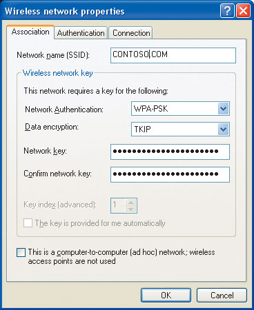 Чтобы использовать WPA-PSK или WPA2-PSK в беспроводной сети, необходим узел доступа (Access Point, AP), совместимый с одним или обоими стандартами. Во многих AP реализованы оба стандарта, и их удобно использовать на предприятиях с разными беспроводными клиентами. В некоторых узлах доступа высокого класса можно даже одновременно задействовать WPA, WPA2 и WEP. Следуйте инструкциям, приведенным в руководстве для узла доступа, чтобы настроить Service Set Identifier (SSID — удостоверение для беспроводной сети), выберите WPA, WPA2 или оба стандарта, в зависимости от требований конкретной сети, и введите надежный, заранее переданный ключ, который будет трудно разгадать фальшивому беспроводному клиенту.