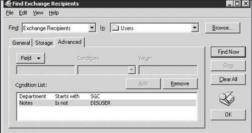 Для определения того, какие почтовые ящики могут получать сообщения, в динамических списках рассылки применяются запросы на базе протокола LDAP. Чтобы прекратить доставку сообщений в почтовый ящик, который обычно входит в состав динамического списка рассылки, следует сформулировать запрос LDAP таким образом, чтобы он не был обращен к деактивированным почтовым ящикам. Мне неизвестно, каким образом можно исключить ящики по такому признаку, как пребывание их учетных записей в каталоге AD в неактивном состоянии. Так что придется добавлять к деактивированной учетной записи флажок и модифицировать LDAP-запрос динамического списка рассылки таким образом, чтобы он возвращал информацию о состоянии этого переключателя. Скажем, если запрос динамического списка рассылки отбирает членов в соответствии со значением поля Department, придется добавить второе условие для исключения объектов из списка, как показано на экране 1. В этом примере объект исключается из динамического списка рассылки, когда в поле Notes учетной записи в каталоге AD добавляется DISUSER; в иных случаях объект включается в этот список. Вообще говоря, попытки заблокировать доставку с помощью динамических списков рассылки не оправдывают затраченных усилий (сказанное не относится к тем сетям, где активно используются динамические списки рассылки или где на адреса этих списков приходят объемные сообщения).