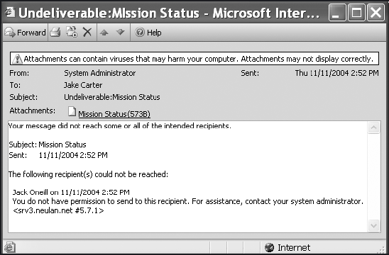 Когда обычный отправитель направляет в этот почтовый ящик свое сообщение, оно возвращается с извещением о невозможности доставки адресату, как показано на экране 3. Эти два способа позволяют экономить дисковое пространство и позволяют извещать отправителей о том, что сообщение не было доставлено, но они имеют ряд недостатков. Извещение о недоставке сообщения адресату не содержит указаний на то, почему учетная запись перестала принимать сообщения. Более того, поскольку эти приемы не предполагают направления сообщений в почтовый ящик, при их использовании невозможно применять извещения Out of Office.