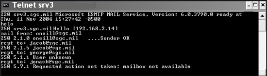 На экране 4 показан сеанс связи по протоколу SMTP с использованием средств фильтрации получателей. Как мы видим, сервер обнаружил адрес Jacob в каталоге AD и принял это сообщение с кодом ответа 250 2.1.5. Но сервер не обнаружил адресов George и Jonas и вернул различные коды ответов SMTP в соответствии с причинами, по которым сообщение было отвергнуто. Впрочем, фильтрация получателей не всегда безопасна. Злоумышленник может узнать, какие учетные записи содержатся в каталоге AD, воспользовавшись полученными в ходе атаки типа «подмена каталогов» кодами ответов.