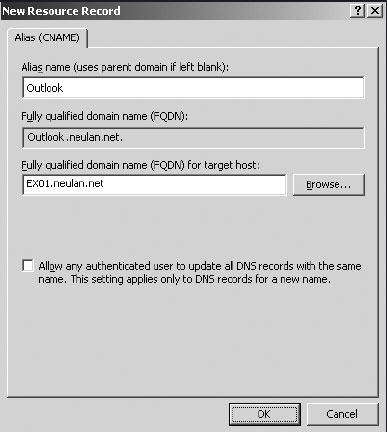 - Указать домен, щелкнуть на нем правой кнопкой мыши, затем выбрать New Alias (CNAME). В диалоговом окне New Resource Record следует ввести Outlook (не указывая домен) в верхнем текстовом поле (экран 3), а в нижнем текстовом поле - ввести полное имя (FQDN) сервера Exchange, щелкнуть на кнопке OK и выйти из оснастки.