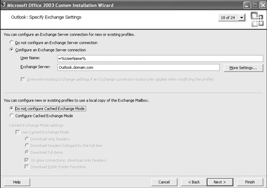 В отличие от имени почтового ящика, имя сервера почтовых ящиков нельзя указать в переменной среды. Необходимо постоянно записывать эту информацию в мастере CIW. Хотя Outlook и CIW не могут работать с переменной среды для имени сервера, существует два способа повысить эффективность процесса преобразования имен почтовых ящиков. Первый подход — создать несколько .mst-файлов, настраиваемых для отдельных сайтов. Этот способ удобен, если нужно применить много других специализированных настроек Outlook (например, в одном сайте пользователям разрешается самостоятельно принимать решение об отправке уведомлений о получении, а в другом — нет).