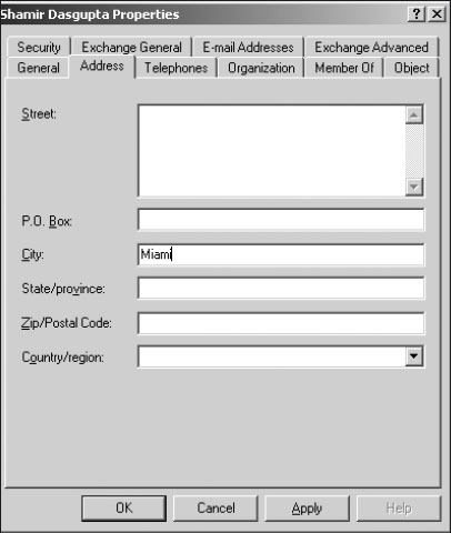 Рекомендуется также установить в каждом контакте атрибут AD, чтобы обозначить контакт как удаленный. Предположим, что недавно приобретенный компанией офис филиала находится в Майами. Создавая контакты для каждого пользователя почтового сервера в Майами, атрибуту City нужно присвоить значение Miami. Этот атрибут находится на вкладке Address листа свойств контакта (экран 2). Полезно назначить еще один атрибут — Telephone Number на вкладке General листа свойств. Благодаря этому атрибуту можно хранить внутри AD номер телефона контакта.