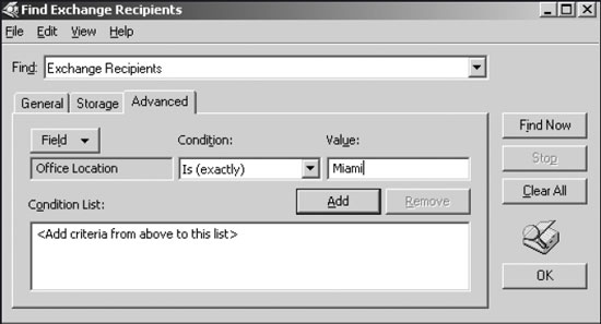 На вкладке General списка свойств требуется установить только флажки Users with Exchange mailbox и Users with external e-mail addresses. Затем нужно щелкнуть на вкладке Advanced и выбрать Contact, Office Location из раскрывающегося списка Field. Как показано на экране 3, параметру Condition необходимо присвоить значение Is (exactly), а параметру Value — такое же значение, как у атрибута Office Location, для которого создается адресный список (например, Miami). После щелчков на кнопках Add и Find Now на экране появится список всех пользователей удаленного офиса. Чтобы завершить создание адресного списка пользователей удаленного офиса, остается щелкнуть на кнопке OK, а затем нажать Finish.