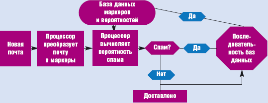 Способная противостоять потоку спама обучающаяся система корректируется в соответствии с поступающей почтой, которую получает пользователь. Большая часть таких систем основана на байесовской фильтрации. На рис. 2 показана обучающаяся система с байесовской фильтрацией. Такая система создает базу данных слов и вероятностей, с которыми эти слова встречаются в почтовом сообщении, содержащем спам. Эти слова могут встречаться в любом месте послания, пришедшего с IP-адреса, и могут иметь произвольный вид. Словам, которые присутствуют в послании, содержащем спам, приписывается более высокий индекс вероятности, чем словам, содержащимся в обычных посланиях.