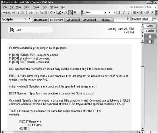 Открывая эти файлы в OneNote, вы увидите, что я создал закладки для большинства стандартных команд сценариев командной строки. Каждая закладка содержит страницы, на которых приводятся сведения о синтаксисе команды из справочной системы, а также несколько примеров ее использования. При двойном щелчке мышью по любому из файлов с расширением .one запускается OneNote, и пользователь получает доступ к содержимому этого файла, структурированному с помощью закладок. Можно самостоятельно добавлять в эти файлы команды, сценарии, фрагменты кода, формируя таким образом грамотно организованное хранилище сценариев.