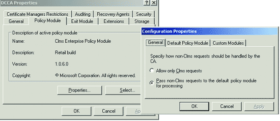 Поскольку CLM имеет отношение к CA (Certification Authority), в продукте реализована интеграция с Windows 2003 CA уровня предприятия (другими словами, реализована интеграция на уровне AD). В процессе установки CLM в Windows CA устанавливаются и активизируются два специальных модуля CLM — модуль политики (policy module) и модуль выхода (exit module), как показано на экране 3. Policy Module добавляет специфические для CLM атрибуты X.509 в Windows CA и, соответственно, в выпускаемые сертификаты. Работа Exit Module позволяет Windows CA связываться с базой данных CLM SQL Server. Модули функционируют в фоновом режиме; за исключением небольшого числа настроек (см. экран 3), непосредственно «общаться» с этими модулями вам не придется.