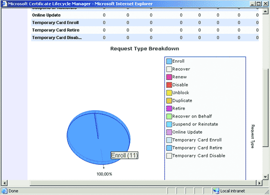 Другая функция, которая порадует администраторов PKI, это многочисленные возможности отчетов в CLM, используя которые не составит труда сгенерировать подробные отчеты по использованию сертификатов и смарт-карт в сети AD. На экране 2 показан пример отчета CLM Request Type Breakdown за указанный период времени.