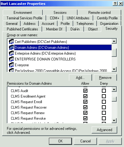 Информация о пользовательских и административных данных CLM, а также описание административного делегирования CLM сохраняются в AD. В процессе установки CLM в AD добавляются следующие специфические CLM-разрешения: CLMS Audit, CLMS Request Enroll, CLMS Enrollment Agent, CLMS Request Recover, CLMS Request Renew, CLMS Request Revoke, CLMS Request Unblock Smart Card и CLMS Enroll.
