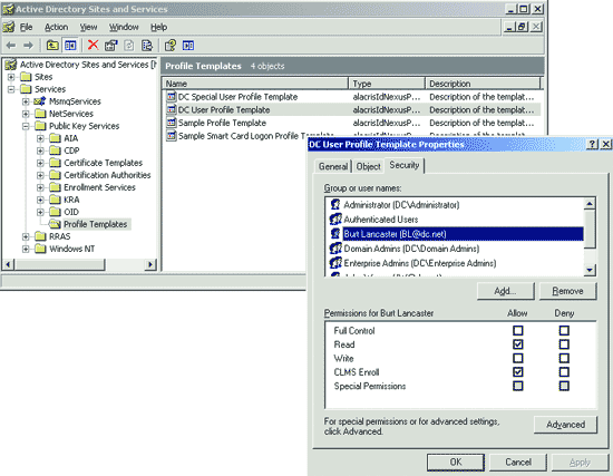 Специфические разрешения CLM могут быть установлены для пользователя AD, группы и профильных объектов CLM при помощи классического управляющего инструментария AD. На экране 5 показано, как предоставить пользователю AD специфические разрешения CLM в оснастке MMC Active Directory Users and Computers. Для того чтобы пользователь получил разрешение развертывать определенный сертификат CLM или тип смарт-карт, администратор CLM должен установить разрешения для соответствующего профильного объекта CLM. Сделать это можно в узле ServicesPublic Key ServicesProfile Templates в MMC Active Directory Sites and Services (см. экран 6).