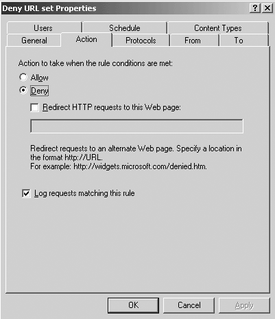 В диалоговом окне Properties для правила нужно перейти к вкладке Action (экран 2), чтобы установить флажок Redirect HTTP requests to this Web page и указать URL-адрес.