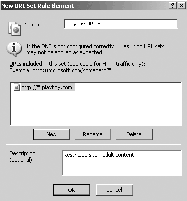 Предположим, требуется, чтобы ни один сотрудник компании не мог обращаться к Web-узлу Playboy из корпоративной сети. Адрес http://www.playboy.com выбран для пояснения фильтрации контента как широко известный источник материалов «для взрослых». Сначала строится типовое правило брандмауэра со значениями, приведенными в таблице. Набор URL-адресов составляется впервые, и готовых вариантов нет. Поэтому следует щелкнуть на кнопке New, чтобы создать новый набор URL-адресов, который будет применен к правилу брандмауэра. На экране 1 показано диалоговое окно New URL Set Rule Element.