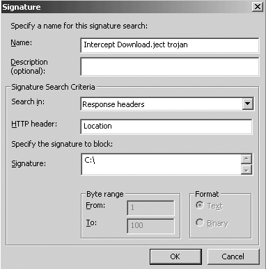 Томас Шиндер, специалист по ISA Server и Web-мастер сайта ISAserver.org, опубликовал статью, в которой объясняется, как настроить HTTP-фильтр ISA Server, чтобы обнаружить и блокировать опасный программный код, встроенный в HTTP-ответ. В рамках метода создается сигнатура на основе заголовков ответа (не тела), а в качестве сопоставляемой сигнатуры вводится C: (экран 4).