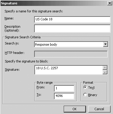 Настроить ISA Server на поиск таких записей и фильтровать отклики — дополнительная мера защиты, которая не требует больших усилий. В приведенном ниже сценарии показано, как обнаружить 18 U.S.C. 2257 на Web-странице и блокировать контент.