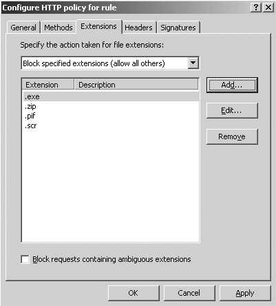 Применяемые настройки внутри HTTP-политики специфичны для индивидуального правила Allow сервера ISA. Благодаря этому можно создать различные наборы HTTP-фильтров на основе правил брандмауэра. Например, кому-то из пользователей, но не всем можно разрешить загружать выполняемые файлы.
