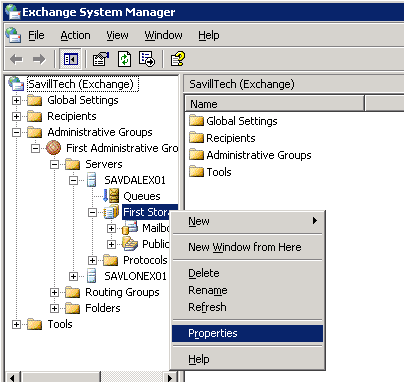 - Щелкните правой кнопкой мыши на группе хранения, для которой нужно активизировать циклическое ведение журналов и выберите пункт Properties (журналы транзакций составляются для групп хранения, а не для баз данных), как показано на иллюстрации.