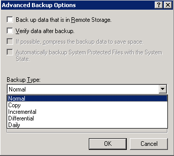Чтобы выбрать тип архивирования (например, нормальное, копия, инкрементальное), следует нажать на кнопке "Start Backup", затем на кнопке Advanced, как показано на иллюстрации.