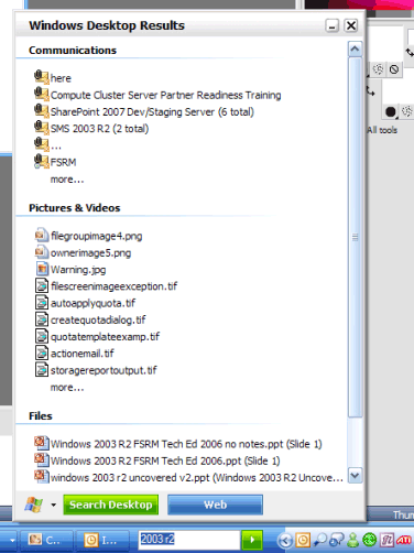 С помощью мастера можно также выбрать дополнительные модули расширения (например, модуль расширения Adobe PDF) и активизировать панель Windows Search Deskbar, которая находится в панели задач Windows, для ускорения доступа. Чтобы использовать утилиту, следует ввести критерий поиска в поле Search Desktop, и на экране появится список результатов, или щелкнуть на кнопке "Search Desktop" для запуска полного интерфейса, в котором есть полные функции предварительного просмотра, как показано на иллюстрации.