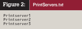 Также можно с помощью одной команды вывести список принтеров совместного использования от нескольких принт-серверов. Поместите список принт-серверов в тестовый файл и укажите имя этого файла сразу после символа @. На Рисунке 2 показан пример текстового файла PrintServers.txt. Следующая команда генерирует список принтеров совместного использования для каждого компьютера, указанного во входном файле PrintServers.txt, и перенаправляет результаты в выходной файл PrintServers.tsv: